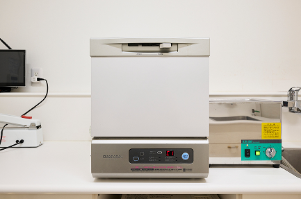 使い捨てできない器具は、洗浄・超音波洗浄、滅菌といったステップで衛生管理を行っています。 最初の洗浄を行うのが、この器具洗浄器です。 複雑な構造をした器具も含めて汚れを徹底的に洗浄することができます。